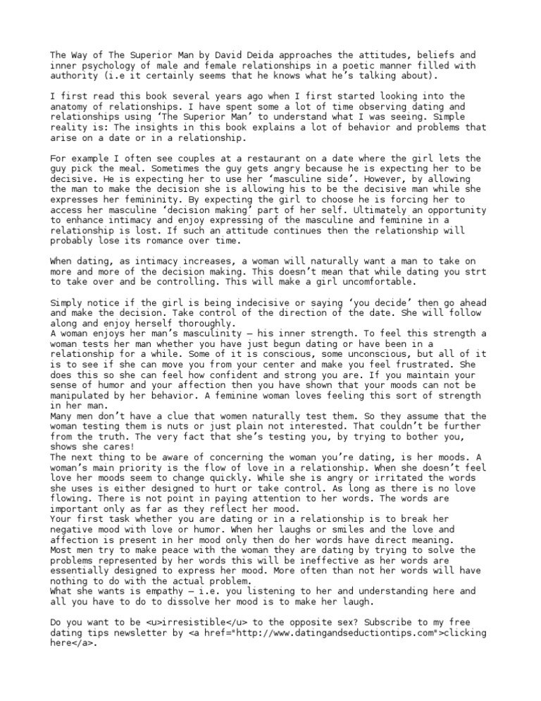 The Way Of The Superior Man DOWNLOAD READ ONLINE. THE WAY OF THE SUPERIOR MAN this trend toward sexual similarity can be seen as a major cause of todays unhappiness in intimacy. David Deida - The Way of the Superior Manpdf - Google Drive.